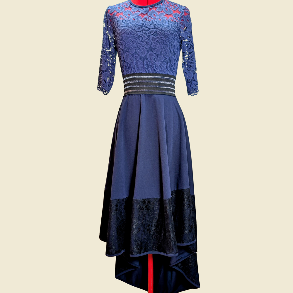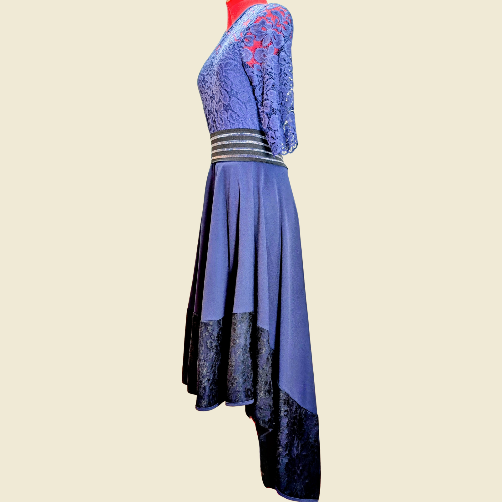 The asymmetrical skirt, beautifully finished with lace, flows gracefully for a feminine, romantic feel.