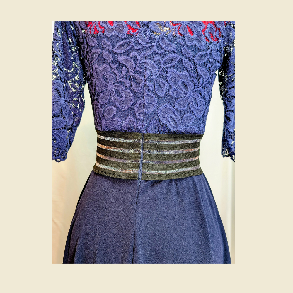 The crew neck and fitted waist create a flattering silhouette, while the transparent 3/4 sleeves add a delicate touch.