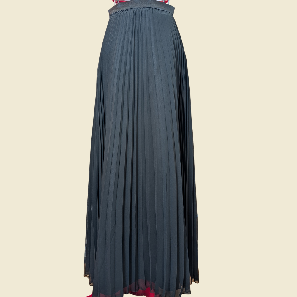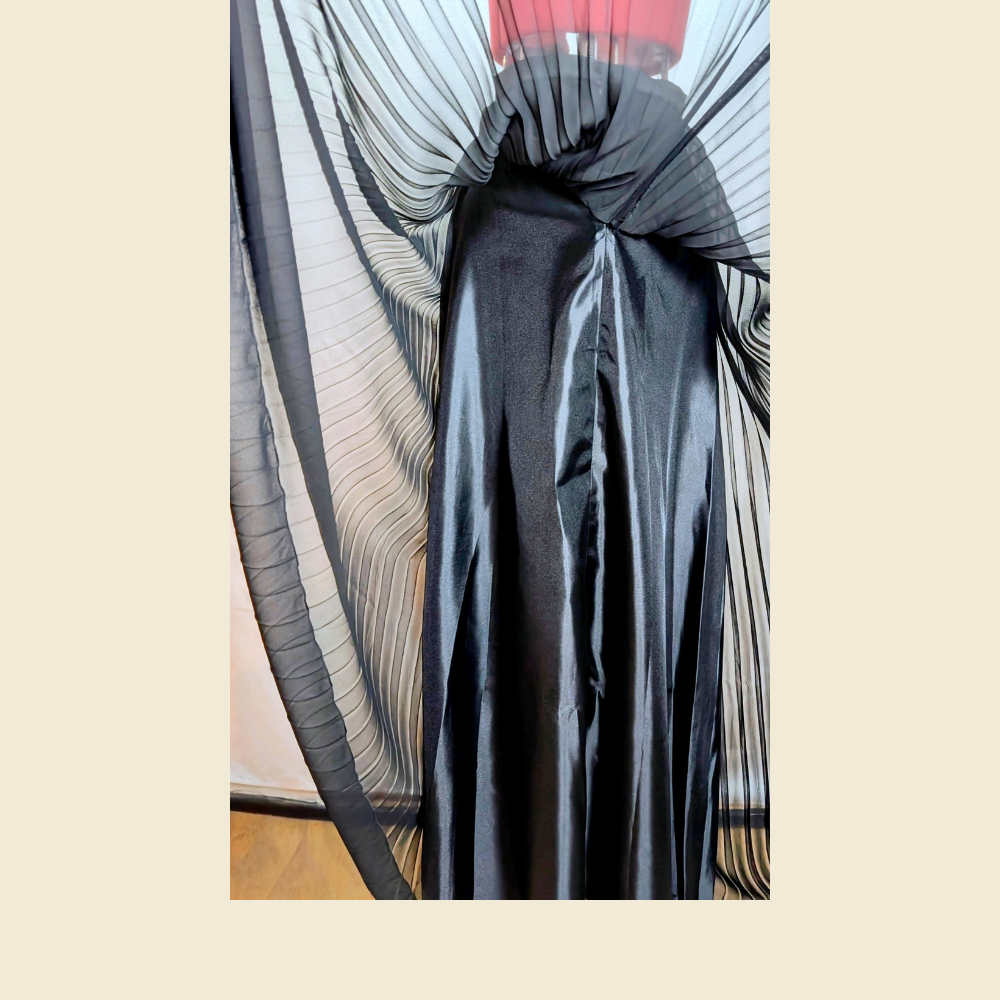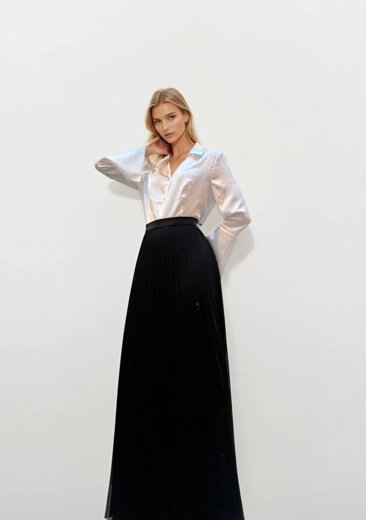 Crafted from Crepe Satin Elastane and Georgette Plisse, the fabric offers a luxurious texture with a slight stretch, ensuring both comfort and a flawless fit. The shirt-style bodice adds a classic touch, while the delicate pleats of the skirt bring movement and flow, making this dress ideal for both professional settings and elegant evenings.