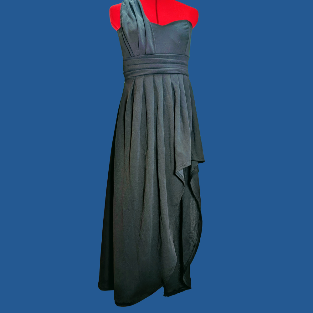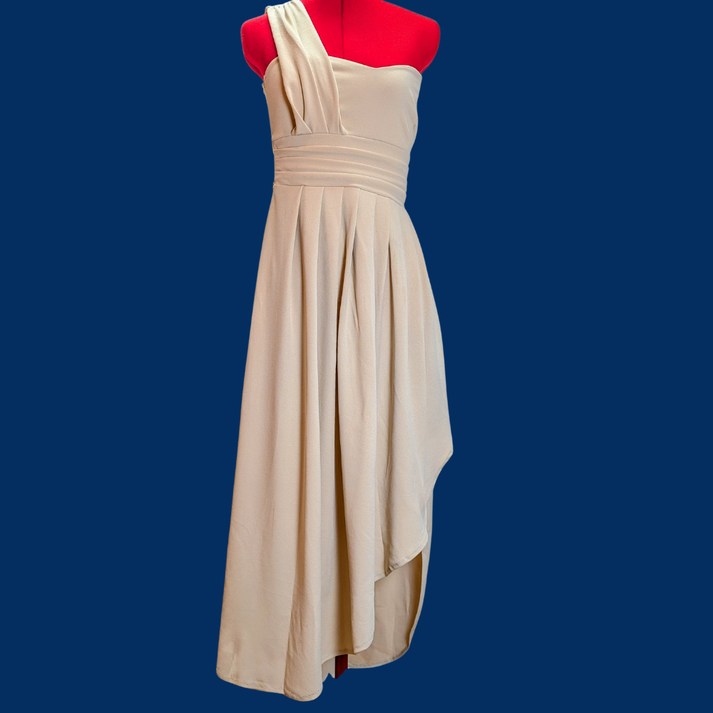 Made from a luxurious blend of premium fabric, this dress features a flattering asymmetrical neckline and wide shoulder straps that create a modern, striking silhouette.