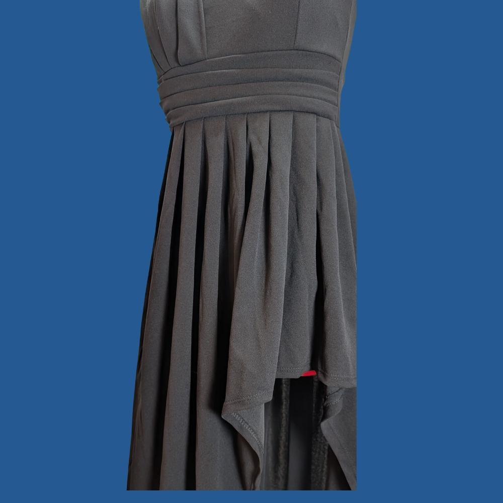 The fitted top enhances your figure, while the wide, flowing skirt with asymmetrical length adds movement and grace.