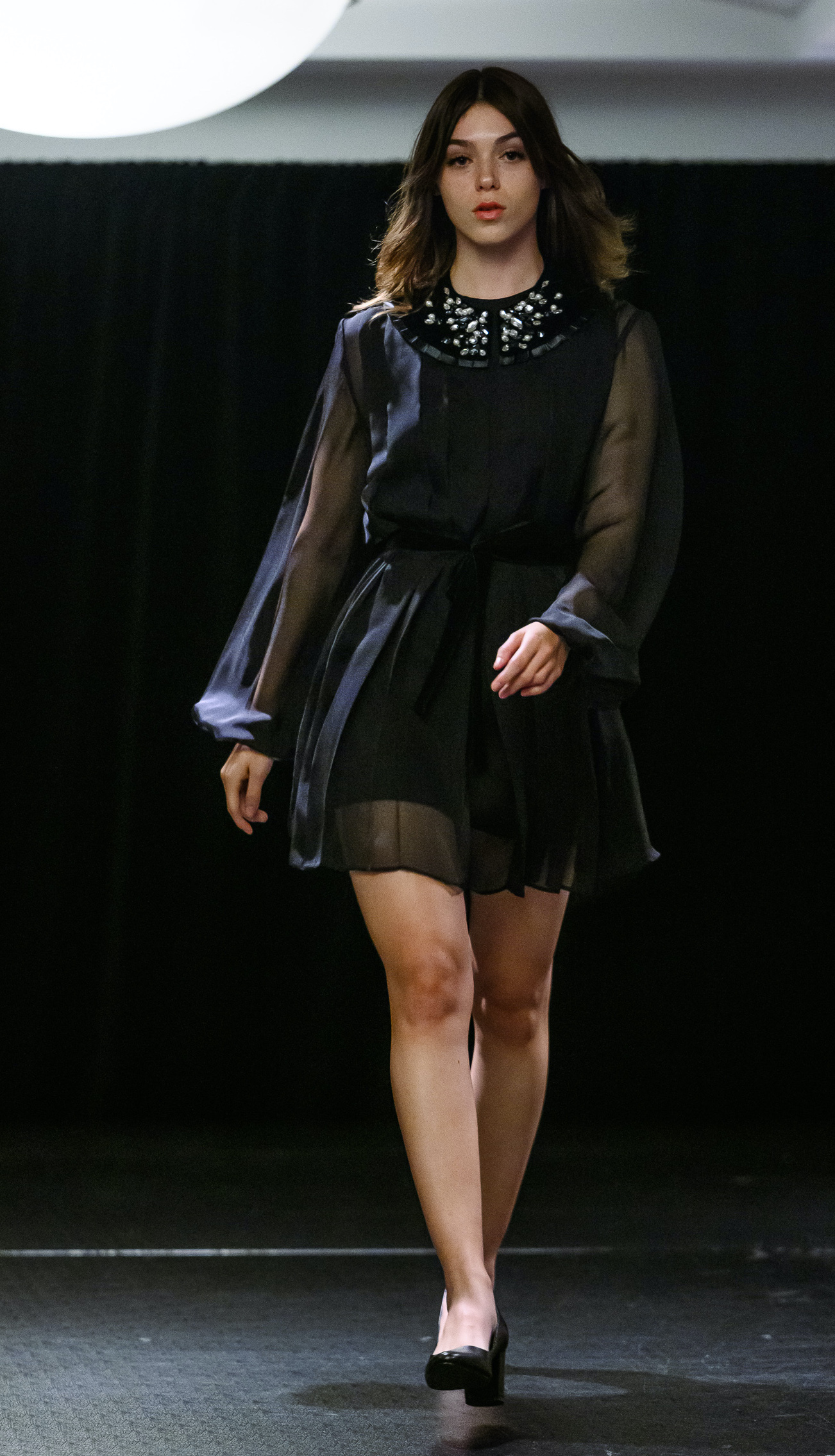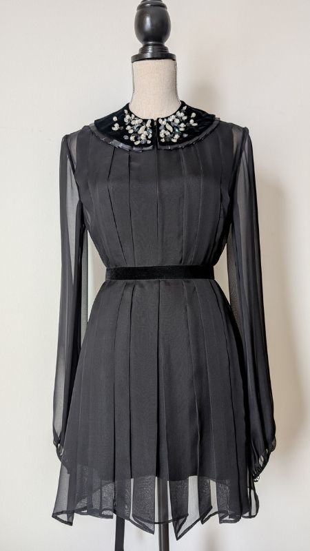 Effortlessly elegant and irresistibly feminine, this black mini dress is made from silk chiffon that drapes with light, airy movement. The sheer long sleeves and soft flow of the skirt create a romantic silhouette, perfectly balanced by the dress’s structured bodice and refined detailing.