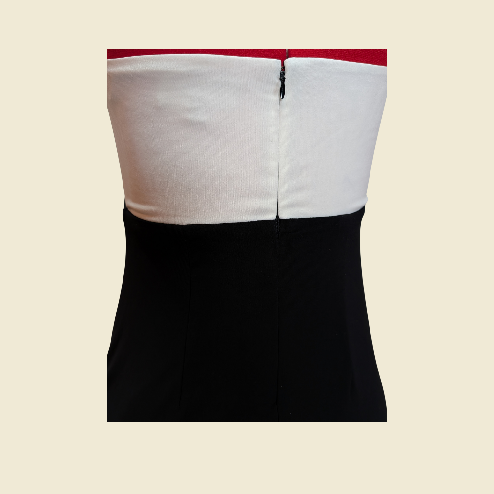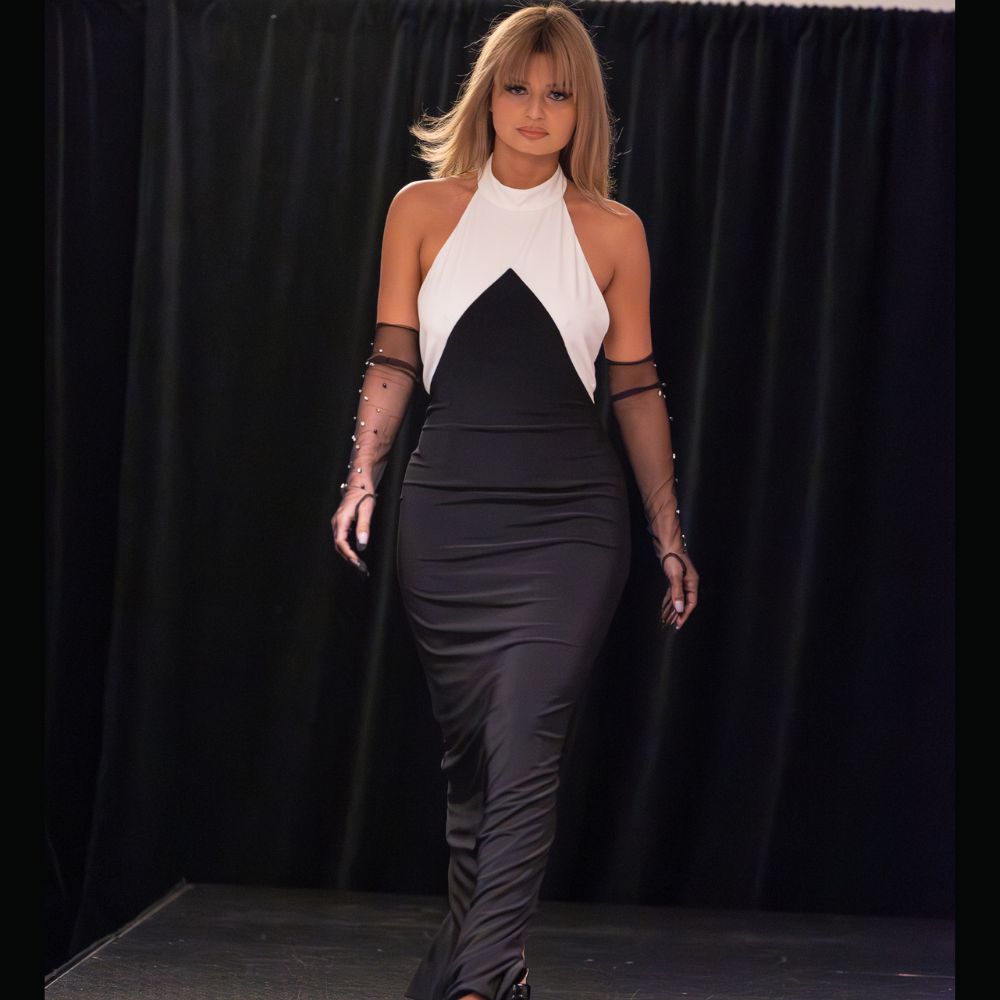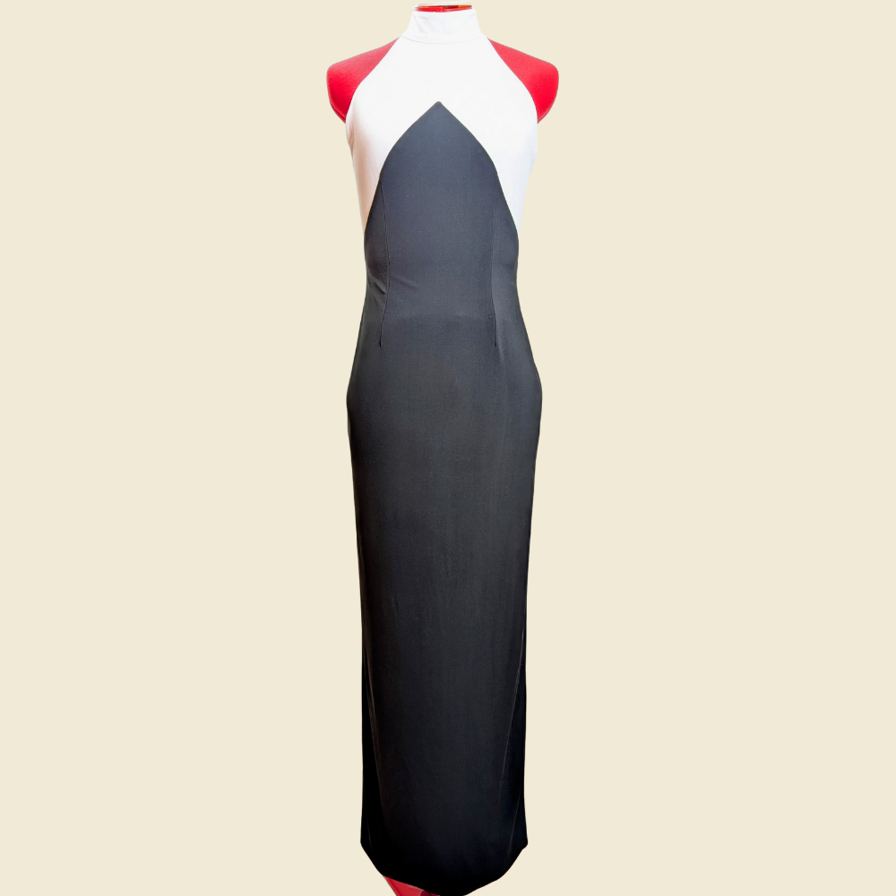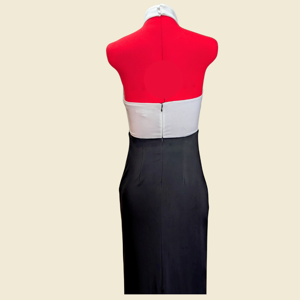 Now crafted from premium Super Jersey (95% PES, 5% Spandex, 240 g/m²), this piece blends structure with softness. The white top features a captivating open back, while the long, slim black skirt enhances and elongates the silhouette.